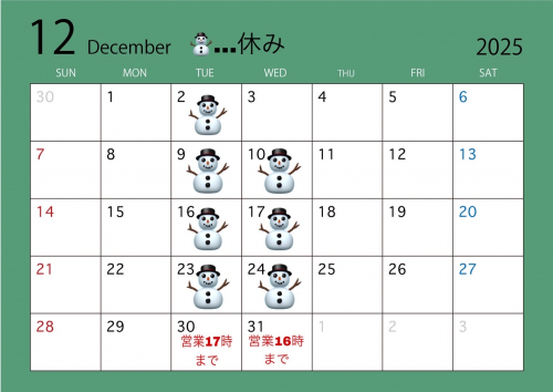 12月のお休み、年末年始のお知らせ